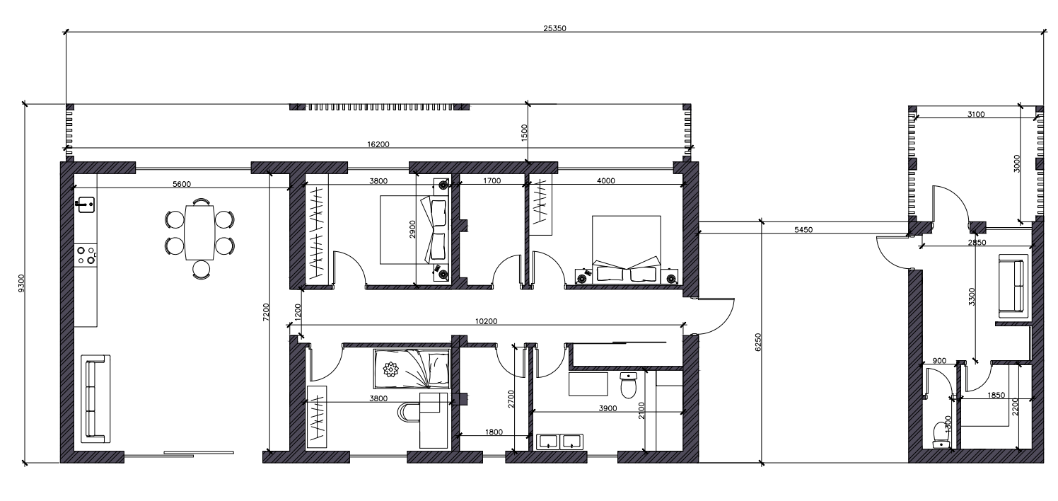 Один из самых удобных и комфортных проектов наших домов, в состав помещений входит не только жилая часть, но и банный комплекс с террасой и навес для авто.